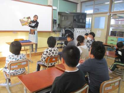 学校司書の先生に読み聞かせをしていただきました!『のっぺらぼう』という少し怖いお話です。「うわっ!」と声をあげながらも楽しんで聞いていました。