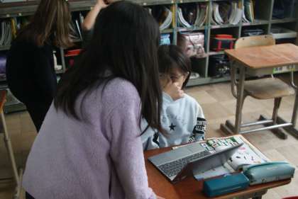 足跡クイズや漢字クイズなど、自分で作ったクイズを友達に出し合いました。「What's this?」や「It's 〜.」という表現を使って楽しくクイズを出し合うことができました。