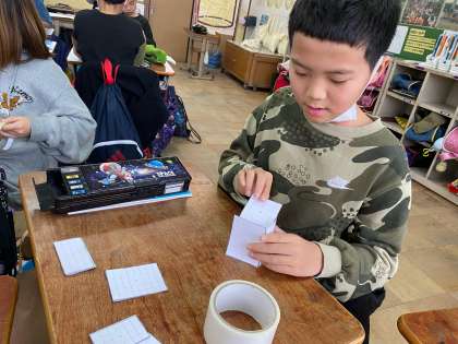 正方形や長方形の形を使って、色々な箱を作りました。できた形から気付いたことを話し合うことで、できた形が「直方体」や「立方体」ということを学習しました。
