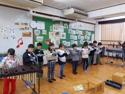 それぞれの楽器の音を聞き合いながら楽しんで合奏していました。