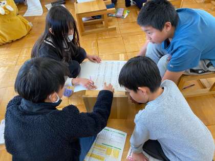 「赤いやねの家」の曲をどのように歌えばよいのかをグループで話し合いました。子どもたちは楽譜の強弱記号にも注目しながら、進んで考えを話し合っていました。