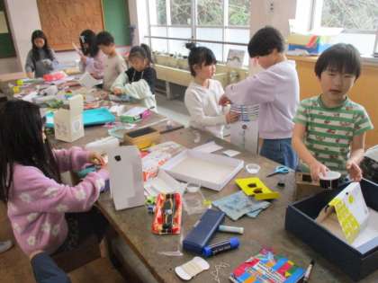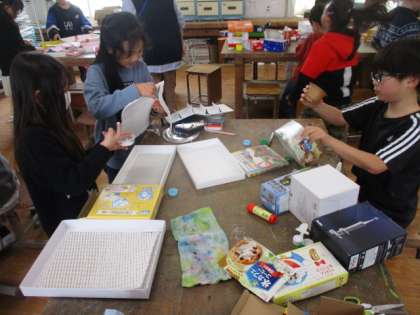 友だちハウスでは、箱やいろいろな材料を使ってハウスを作っています。どのような家ができるか楽しみです。