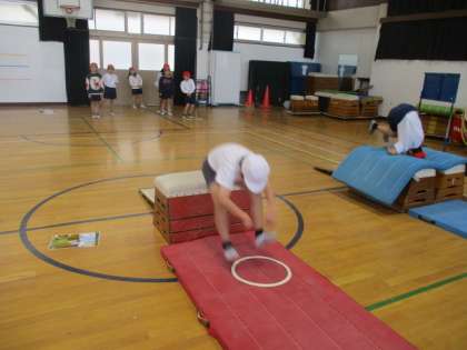 とびばこあそびでは、いろいろな場でいろいろな遊びに取り組んでいます。ペアでアドバイスをし合いながら取り組んでいます。