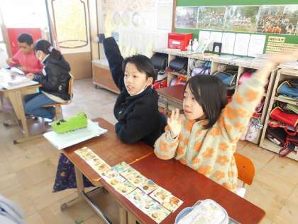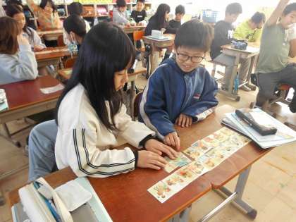 英語での日課の言い方を聞きながら、カードを並べ替える活動をしました。ペアで協力しながら取り組みましたが、どのペアもしっかりと日課を聞き取ることができていました。