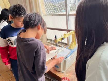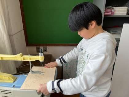 図画工作科の学習では、電動糸ノコギリを使って、板を切り「でこぼこの絵」を作っています。初めての電動糸ノコギリですが、安全に気をつけて上手に使うことができました。