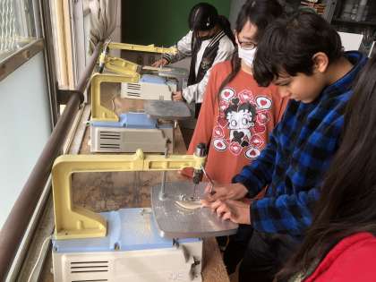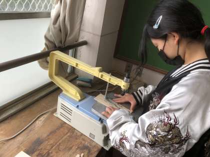 電動糸のこぎりを使って,木の板を切り、その木をでこぼこに重ねて木で絵をつくっています。初めての電動糸のこぎりも安全に気を付けながら、上手に扱うことができました。