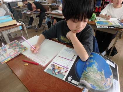 地球の衛星写真や地球儀を見て分かったことをクラスで話し合いました。また、学習の後半には、地球儀の使い方を確かめました。