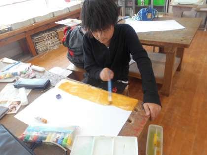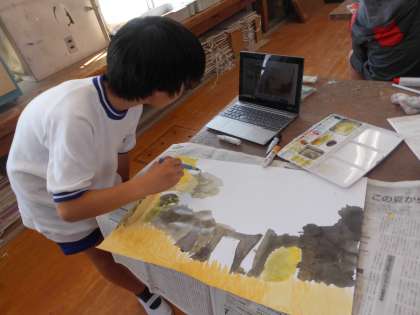 絵の具と筆を使って空を描きました。時間も場所も季節も違うそれぞれの空が完成しました。