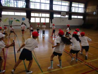 体つくりの運動では、友だちと楽しくなかよく活動しました。