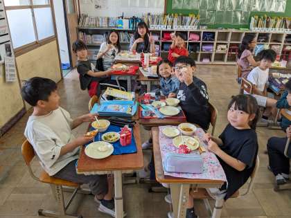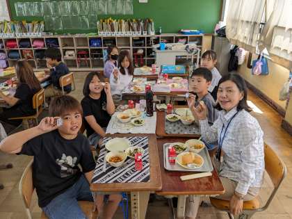 ALTの先生とも一緒に外国語の学習をし、給食も一緒に食べました。写真を撮っているとチャン先生から英語では「Say, cheese !」と言うということを教えてもらいました。そして、なんと給食のメニューに「チーズ」が出ていたので、みんなでチーズを持って、「Say, cheese !」のかけ声で写真を撮りました☆