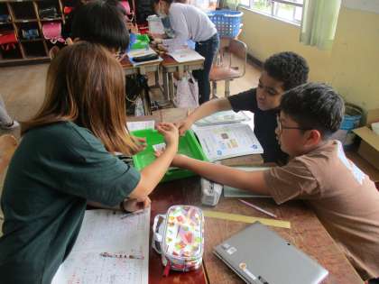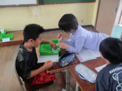 前回の学習で準備した、「あたたかい場所」「冷たい場所」とを比べる温度の実験、「空気にふれる」「空気にふれない」の2つを比べる空気の実験の結果が出たので、グループごとに発芽の状況をまとめて交流をしました。