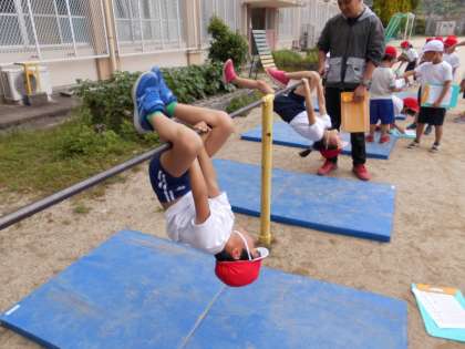 体育でてつぼうあそびの学習をしています。もう少しでできそうな技に挑戦したり、連続でできる技に挑戦したりしています。友達とアドバイスしないながらがんばっています。