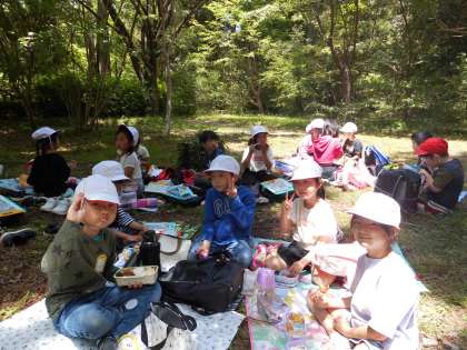 植物園の中を探検した後は、待ちに待ったお弁当タイムでした。どの子も幸せそうにお家の人に作ってもらったお弁当を食べていました。とても楽しい遠足になりました。1年生と2年生も仲良くなりました。