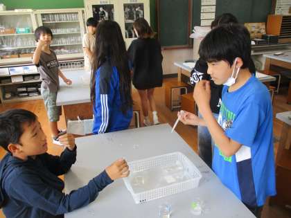 うすめたでんぷんの液の中に、唾液を染み込ませた綿棒と水を染み込ませた綿棒とを入れて、どのような変化が起こるのかをヨウ素液を使って確かめました。