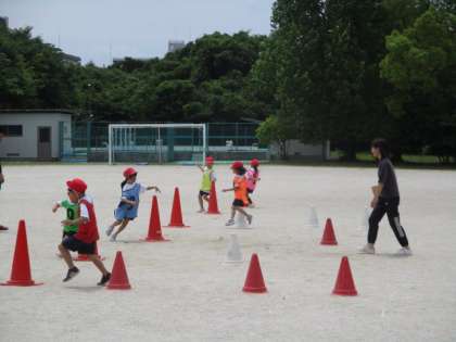 友だちといっしょに、リレー遊びを楽しんでいます。