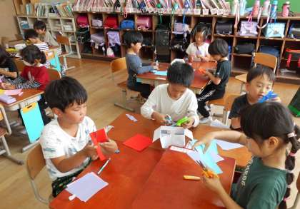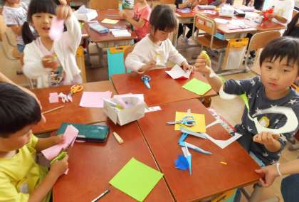 図画工作科の学習で,はさみを使ったかざり作りをしました。折り紙を折ったり、重ねたりしたものをはさみで切ると、きれいなかざりが出来上がります。子どもたちは夢中でたくさんのかざりを作っていました。