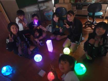 少し間が空いてしまいましたが、前の学習で作った作品に明かりをともしてみました。暗い部屋の中で明かりをともすと、子どもたちから「おぉ〜!」という声が。自分の作品の出来に満足そうにしている子どもたちがかわいかったです!
