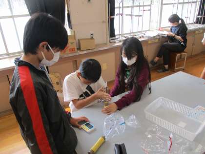 空気を吸ったりはいたりするときのことを実験して調べています。