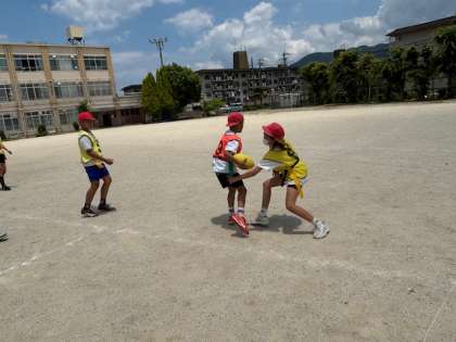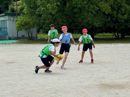 体育では、タグラグビーの学習をしています。攻め方や守り方を工夫しながら頑張っています。