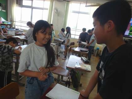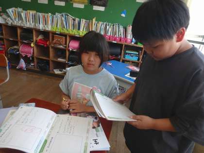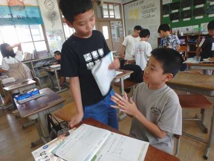 「ひとふみ十年」の話を読み、自然を守るために大切な気持ちや自分にできることを考えました。
