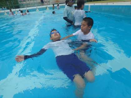 服を着た状態で水の中に入ると、どれだけ動きにくいかを体感した後、鼻と口だけを水上に出し、浮いて救助を待つ体勢について学習をしました。