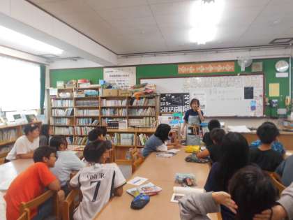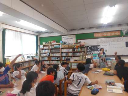 国語の学習で、ブックトークをするので、見本として学校司書の先生にブックトークをしていただきました。6年生の学年目標である「無限大」をテーマに4冊の本のブックトークをして下さいました。