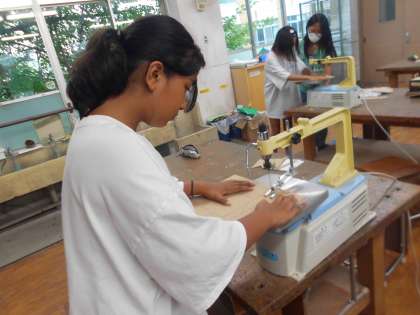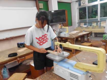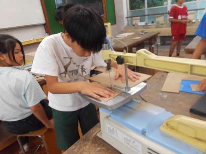 図画工作科では、一枚の板から使える入れ物を作っています。5年生の学習で使った電動のこぎりを使って切っていきました。