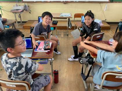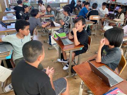 「遠足に行くなら海?山?」と、それぞれに自分の立場を決め、その理由やよさについて考えました。相手を納得させられるような、説得力のある話をするためには、どうすればよいのだろうと考え、グループで話し合いました。