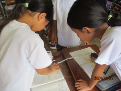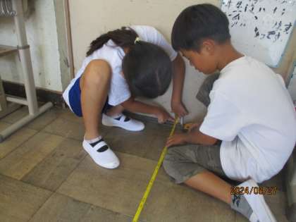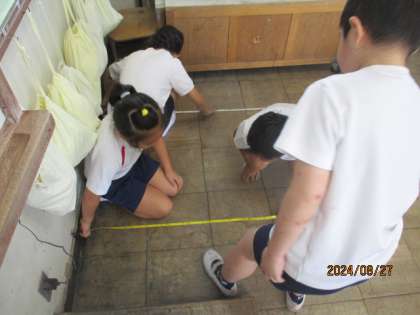 長さの学習で、まきじゃくを使って教室のたてと横の長さを測りました。目盛りの見方を確認してから測りました。