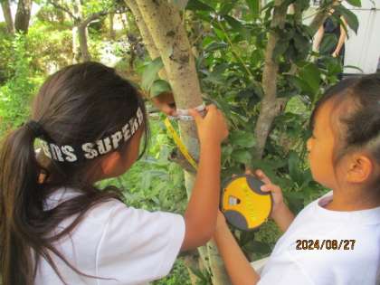 まきじゃくを使って、校庭の木のまわりの長さを測りました。長いものやまるいものの長さを測る時に便利だということを学びました。