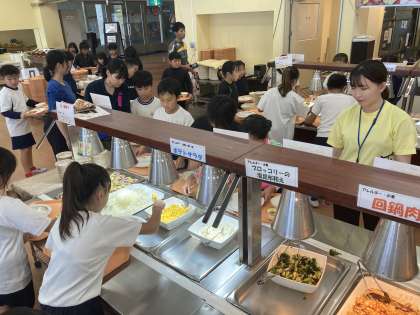昼食は、バイキングでの食事です。自分の食べられる量を考えながら、食べたいものを選んでいます。