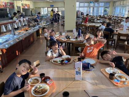 昼とは違うメニューです。メンチカツが人気です。海の活動で疲れましたが、みんな元気に過ごしています。