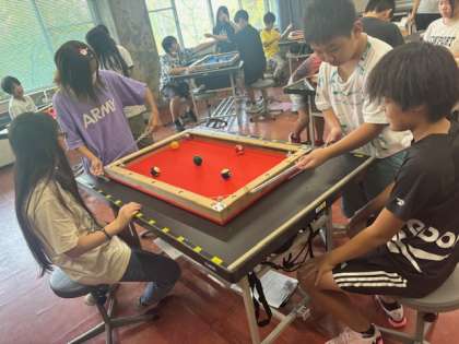 科学センターに行き学習をしました。「衝突」についての学習です。まずは、玉と玉を衝突させるビリヤードをしました。