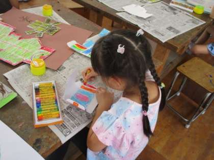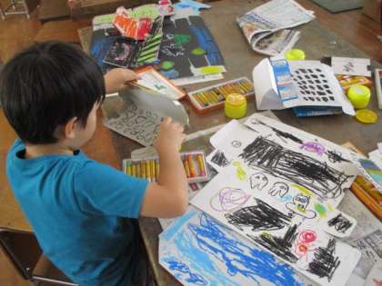 箱を開いた紙の裏にクレパスで絵を描いて…