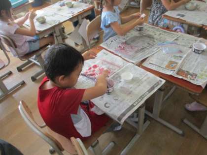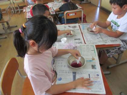 自分たちが育てたアサガオの花と水を混ぜた色水を作りました。