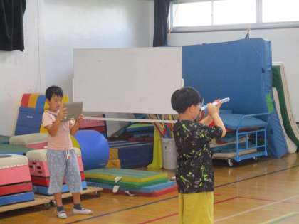 まずは、みんなで空気鉄砲を使って体育館で遊んでみました。