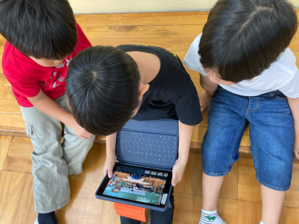 普通ならできないことをiPadを使って「こんなことできました!」と表現します。写真をつなげて動画にします。ペアで、初めて挑戦してみましたが、いろいろと試行錯誤している様子が見られました。
