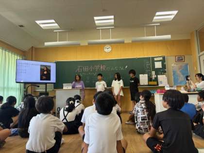 学校案内が終わってからは、石田小学校の紹介をしました。クイズなども盛り上がり、石田小学校のことをしってもらうことができました。
