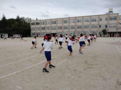 ハチマキを付けて運動場で練習しました。
