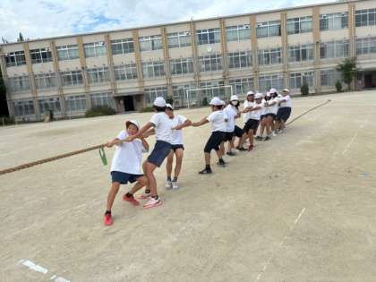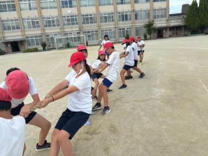 6年生だけのミニ運動会をしました。玉入れ、綱引き、台風の目など、それぞれのチームで作戦を立てて行いました。