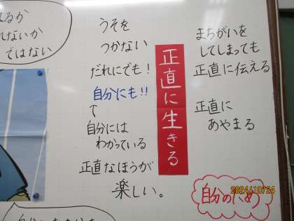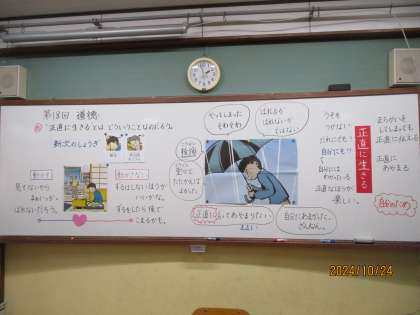資料「新次のしょうぎ」を通して『正直に生きることの大切さ』について考えました。不正をしてしまった登場人物の葛藤や後悔を考えることを通して、正直に生きるとはどういうことなのか、正直に生きる良さは何なのか、子どもたちは互いの意見を聞いて考えを広げたり深めたりしていました。「ばれるかばれないかではない。」「これまでは嘘をつくこともあったけど、自分にも嘘をつくことになるからこれからは正直に生きたい。」「正直に生きた方が楽しい。」などと、今日の学習をこれからにつなげようとする振り返りも見られました。道徳科での子どもたちの気づきはいつも本当に素敵です。
