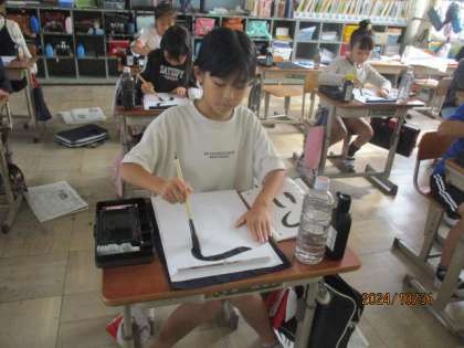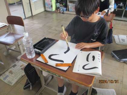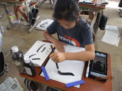 毛筆の学習で「つり」を書きました。ひらがなの筆使いに気をつけて書きました。最後まで丁寧にこだわって書くことができました。