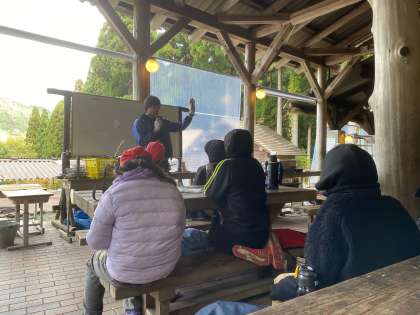 野外炊事に向けて、火おこし体験をしました!山の家の職員さんから説明を聞いています。