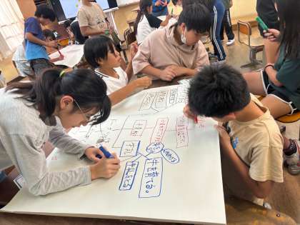 最後には、ドーナツ屋に関わっている仕事をどんどん模造紙に書いていきました。いろいろな仕事をしている人が関わる中で商品が売られるということが分かりました。