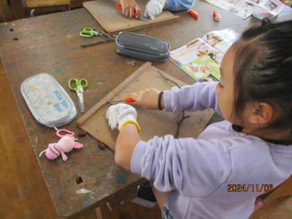 「これでかきたい」という学習で、小刀を使いました。正しく安全に使う方法を学んだあと、自分で見つけてきた枝を削りました。