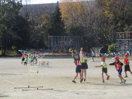2年生の体育で、パスゲームをしています。チームが勝つことを目標に、どうすればたくさん点を取ることができるかを考えながら、作戦を立てています。ゲーム中には、スペースを見つけて、走ったり、パスを出したりして、レベルがどんどん上がってきました。
