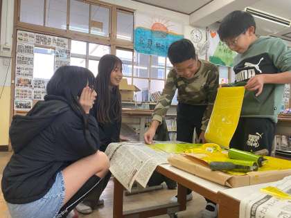 5年生の版画では、彫り進み版画に挑戦しています。残したい色を考えながら、様々な色で版を刷っていきます。この時間には、版を彫り、一色目となる色を刷りました。