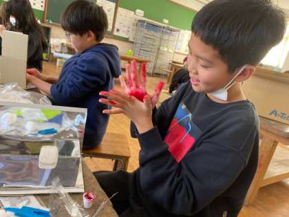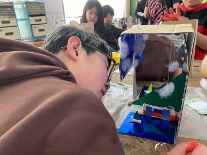 作品づくりがスタートしました。鏡への映り方を確かめながら取り組んでいました。