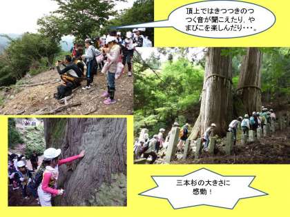 険しい上り坂もあったけれど,子どもたちはお互いに頑張れコールを掛け合いながら弱音を吐かずに登り切り,目的地である三本杉に到着した時はその大きさ・神聖さに感動しました。