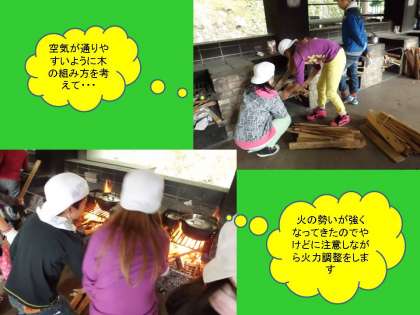 1日目の主な活動は野外炊飯でした。この活動は小栗栖小学校とも合同で行いました。まず山の家の所員の方に火の起こし方を教えていただき,火起こしから始めてかまど作り,調理・・・と進めて行きました。火をおこすだけでも大変な時間と労力を要した班も多く,食事をすることの大変さを体験することができました。
